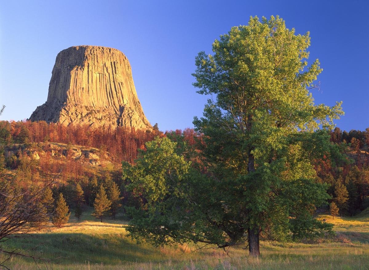 DEVIL'S TOWER NATIONAL MONUMENT SHOWING FAMOUS BASALT TOWER, SACRED SITE FOR NATIVE AMERICANS, WYOMING