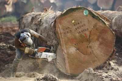 Logger cutting tree trunk, Cameroon
