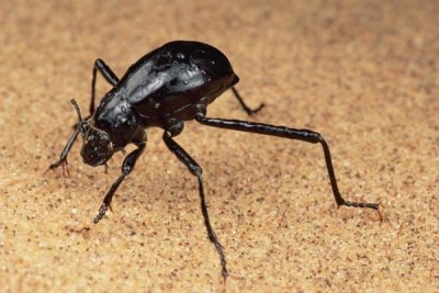 Darkling Beetle bends down to drink dew collected on its back, Namib Desert