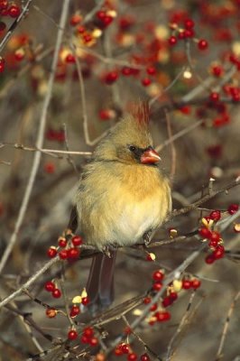 Northern Cardinal female perching in bittersweet, Long Island, New York